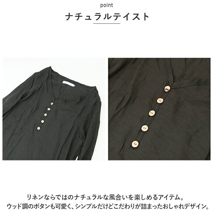 ・リネンならではのナチュラルな風合いを楽しめるアイテム。ウッド調のボタンも可愛く、シンプルだけどこだわりが詰まったおしゃれデザイン。