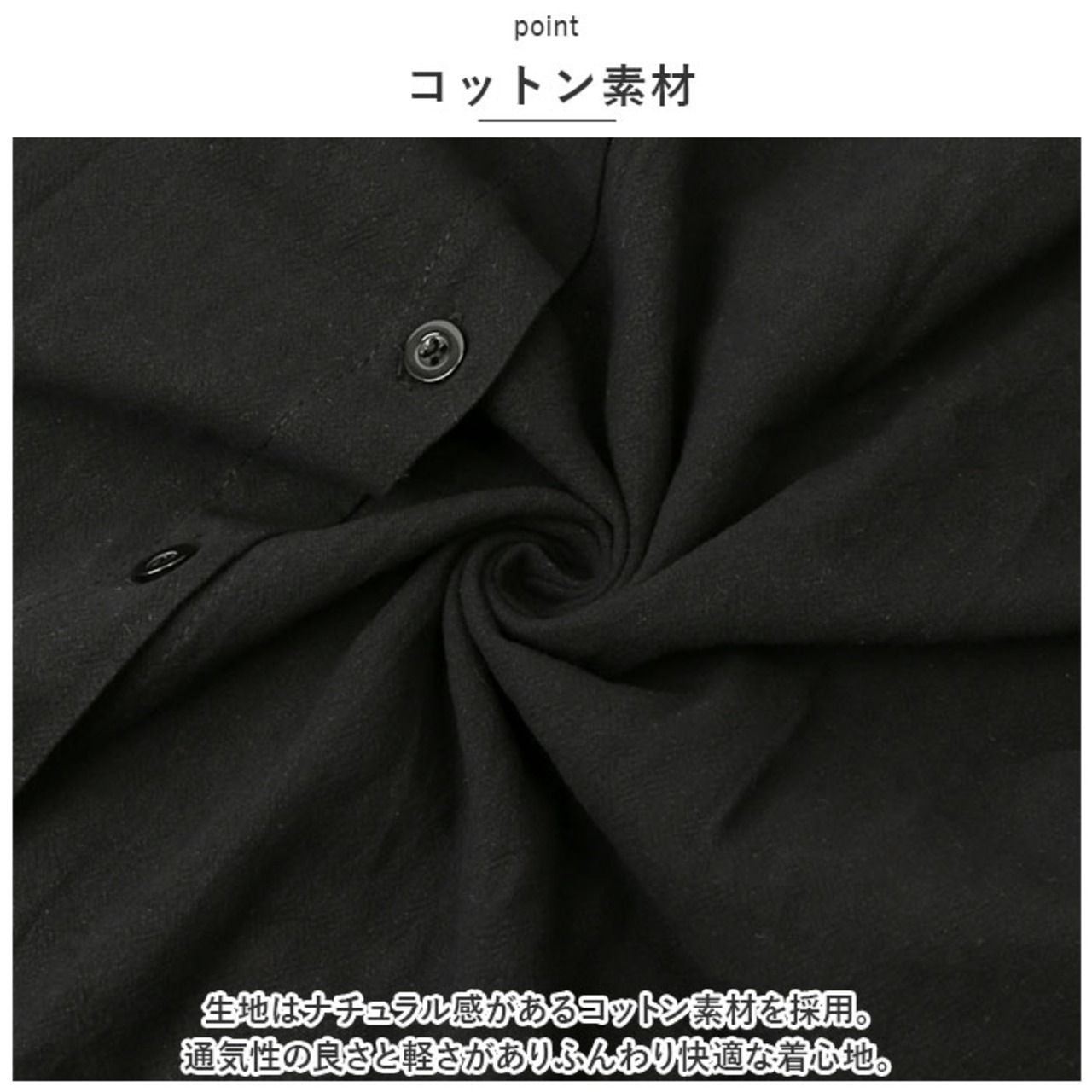 ・生地はナチュラル感があるコットン素材を採用。通気性の良さと軽さがありふんわり快適な着心地。
