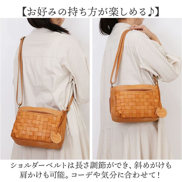 ・ショルダーベルトは長さ調節ができ、斜めがけも肩かけも可能。コーデや気分に合わせて!