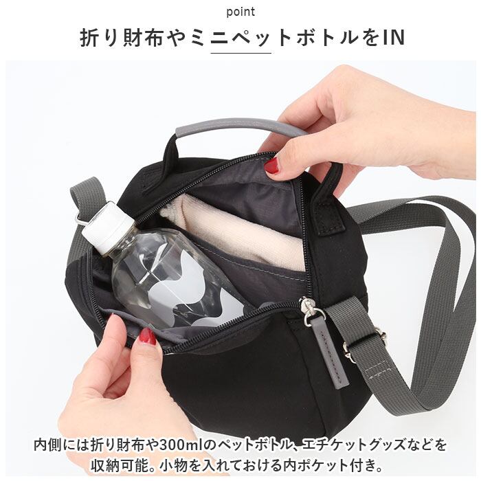 ・内側には折り財布や300mlのペットボトル、エチケットグッズなどを収納可能。小物を入れておける内ポケット付き。