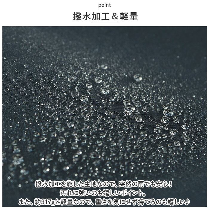 ・撥水加工を施した生地なので、突然の雨でも安心!汚れに強いのも嬉しいポイント。また、約317gと軽量なので、重さを気にせず持てるのも嬉しい♪