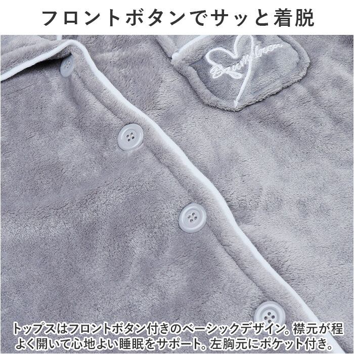 ・トップスはフロントボタン付きのベーシックデザイン。襟元が程よく開いて心地よい睡眠をサポート。左胸元にポケット付き。