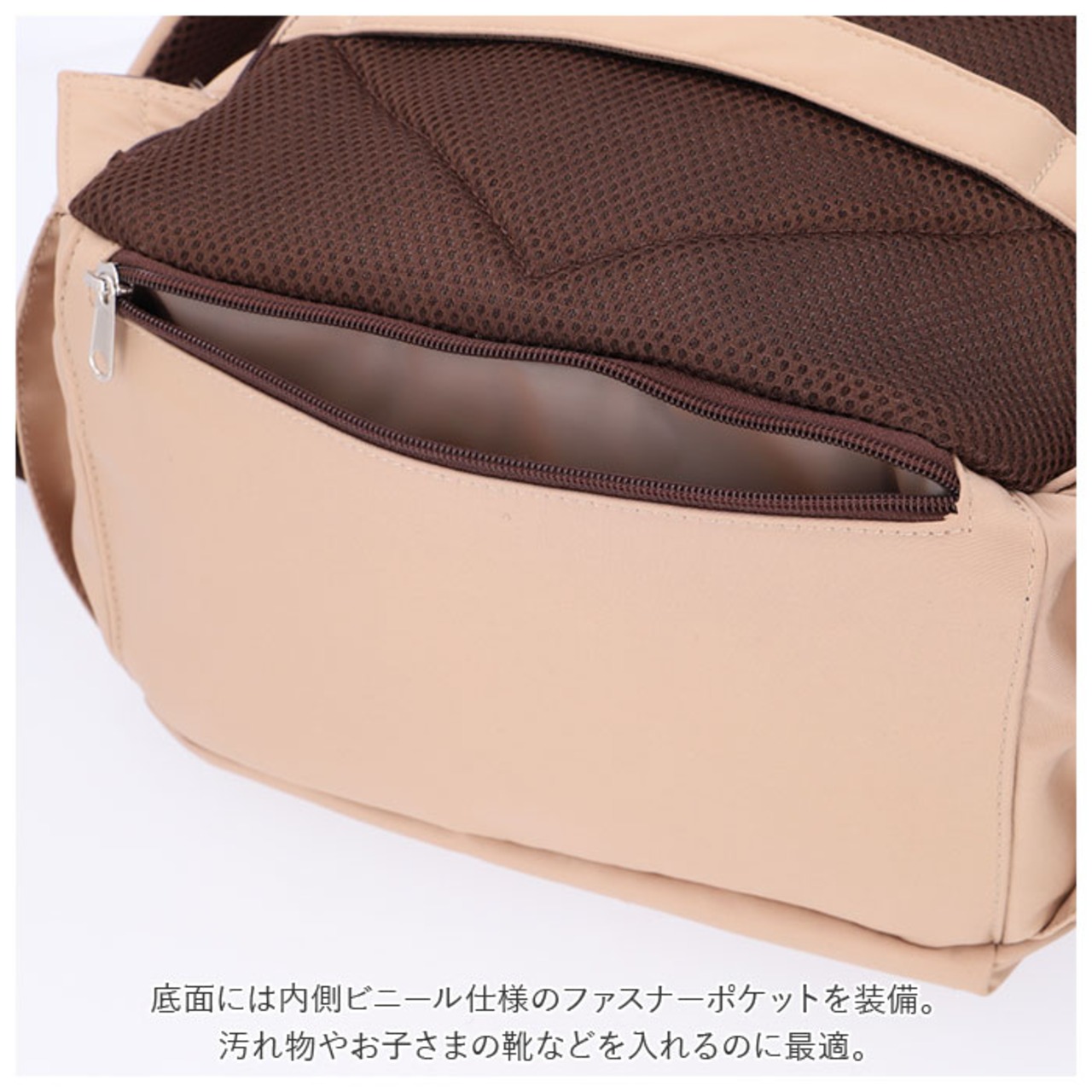 ・底面には内側ビニール仕様のファスナーポケットを装備。汚れ物やお子さまの靴などを入れるのに最適。
