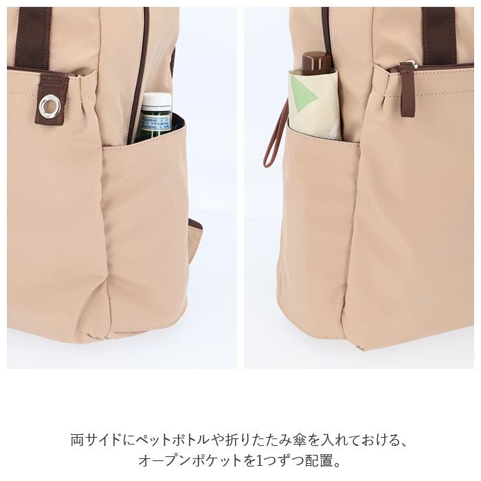 ・両サイドにペットボトルや折りたたみ傘を入れておける、オープンポケットを1つずつ配置。
