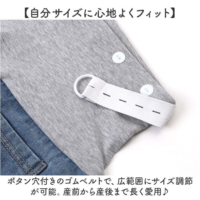 ・ボタン穴付きのゴムベルトで、広範囲にサイズ調節が可能。産前から産後まで長く愛用♪