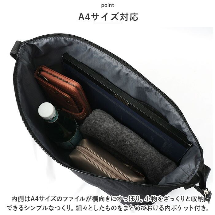 ・内側はA4サイズのファイルが横向きにすっぽり。小物をざっくりと収納できるシンプルなつくり。細々としたものをまとめておける内ポケット付き。