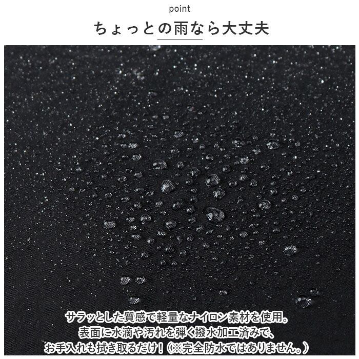 ・サラッとした質感で軽量なナイロン素材を使用。表面に水滴や汚れを弾く撥水加工済みで、お手入れも拭き取るだけ!(※完全防水ではありません。)