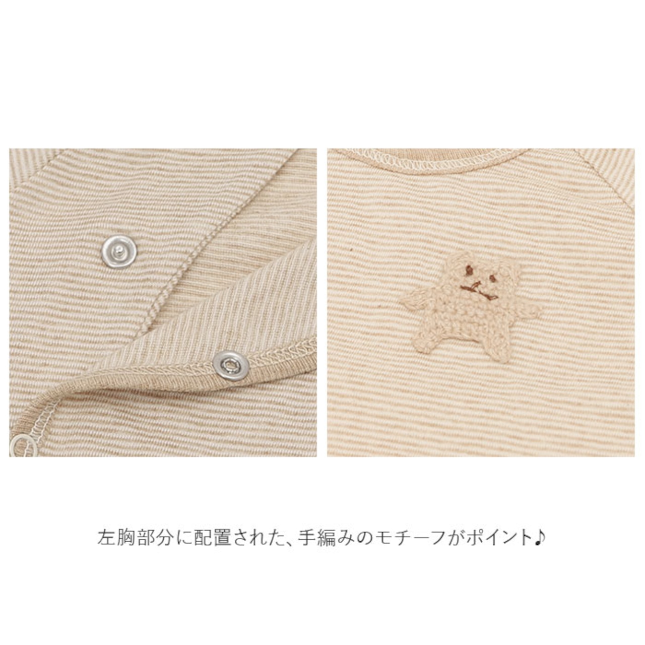 ・ロンパースは左胸部分に配置された、手編みのモチーフがポイント♪