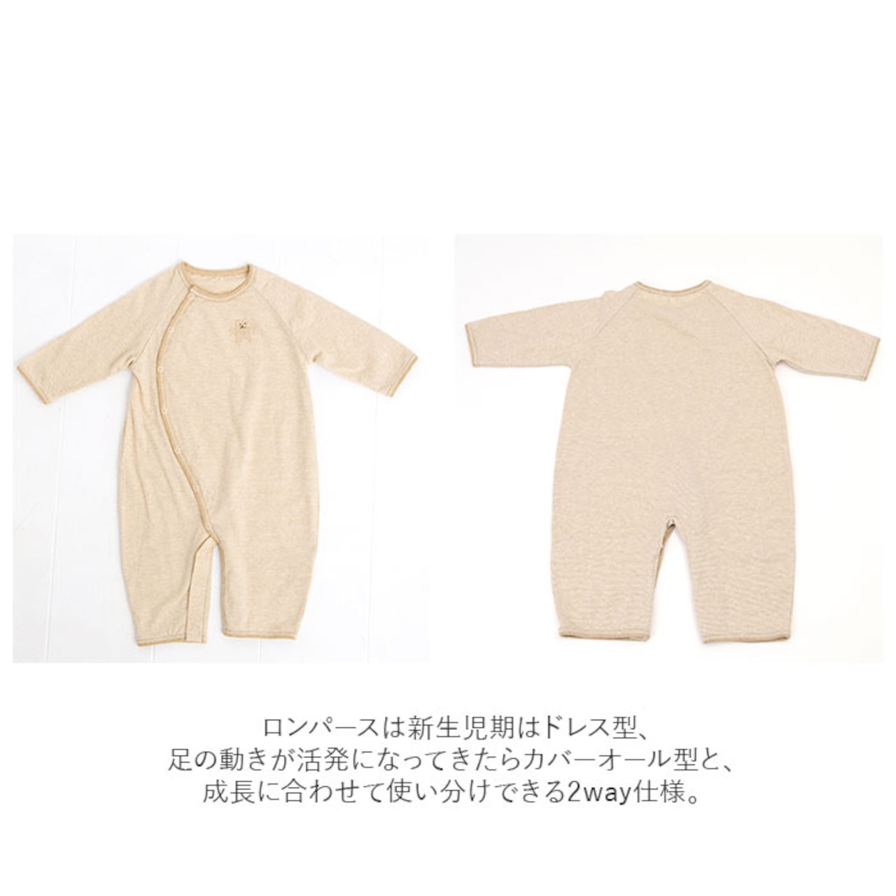 ・新生児期はドレス型、足の動きが活発になってきたらカバーオール型と、成長に合わせて使い分けできる2way仕様。長く着用できるのが嬉しい!