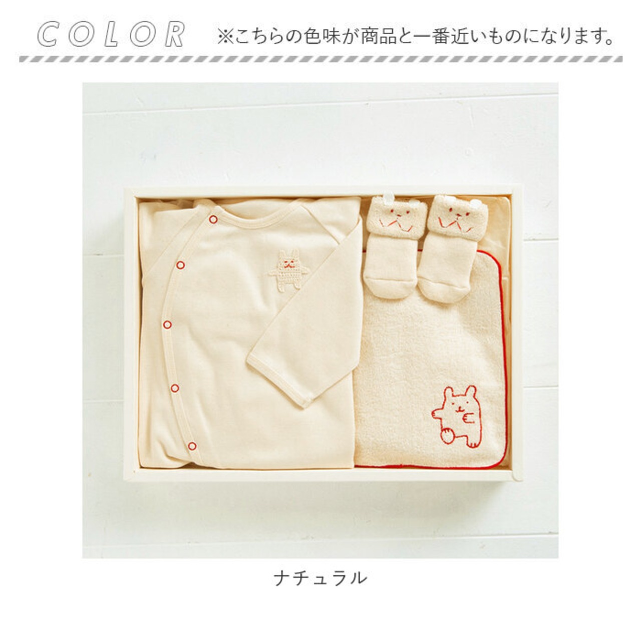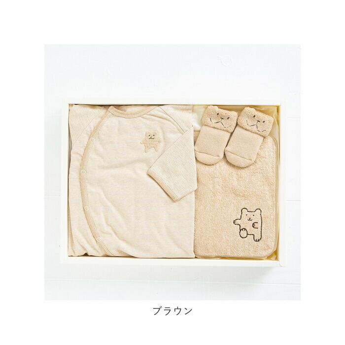 ・ロンパース、パイルソックス、ミニタオルの3点セット。