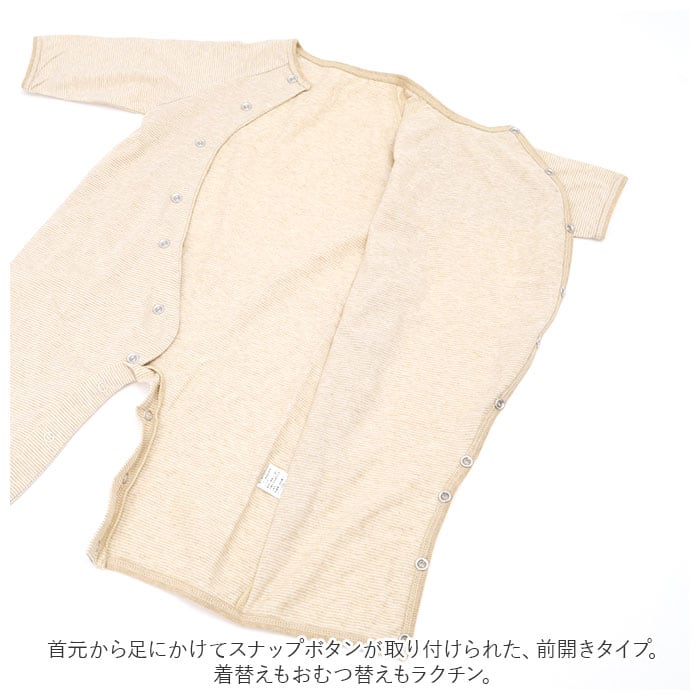 ・首元から足にかけてスナップボタンが取り付けられた、前開きタイプ。着替えもおむつ替えもラクチン。
