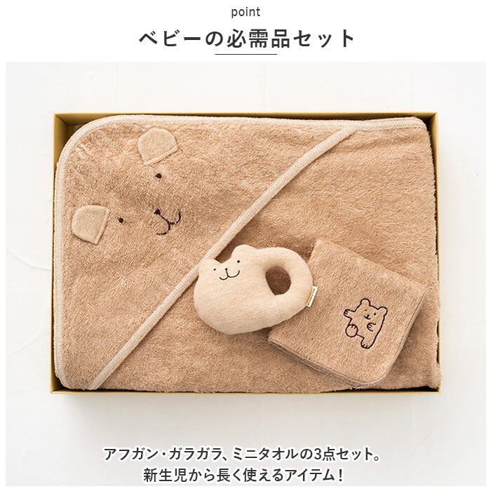 ・アフガン・ガラガラ、ミニタオルの3点セット。新生児から長く使えるアイテム!