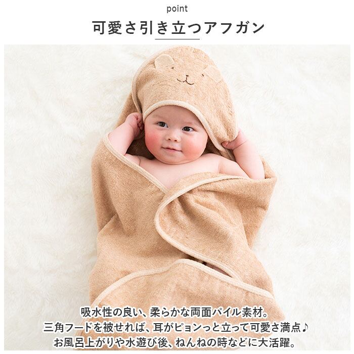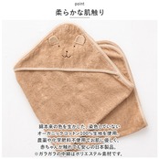 ・吸水性の良い、柔らかな両面パイル素材。三角フードを被せれば、耳がピョンっと立って可愛さ満点♪お風呂上がりや水遊び後、ねんねの時などに大活躍。