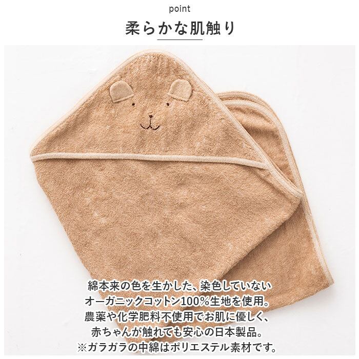 ・綿本来の色を生かした、染色していないオーガニックコットン100%生地を使用。農薬や化学肥料不使用でお肌に優しく、赤ちゃんが触れても安心の日本製品。(※ガラガラの中綿はポリエステル素材です。)