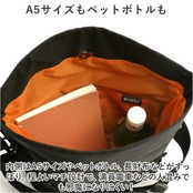 ・内側はA5サイズやペットボトル、長財布などがすっぽり。程よいマチ設計で、満員電車などの人混みでも邪魔になりにくい!