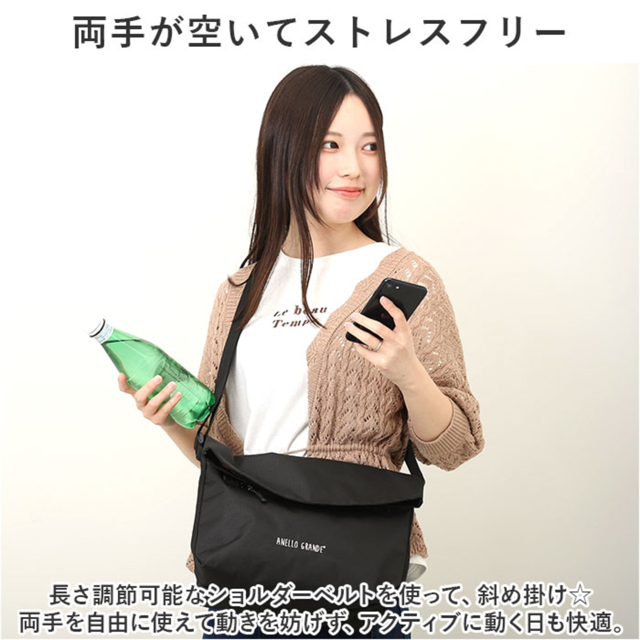 ・長さ調節可能なショルダーベルトを使って、斜め掛け☆両手を自由に使えて動きを妨げず、アクティブに動く日も快適。