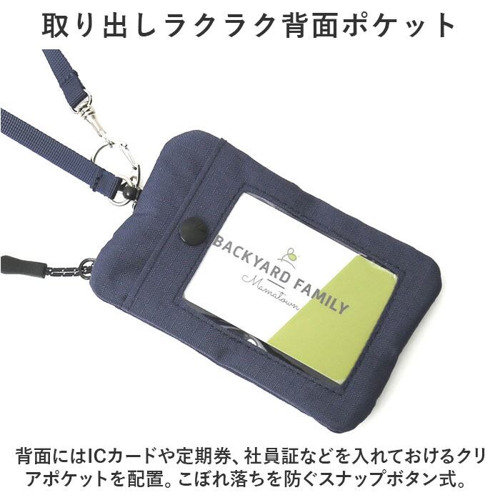 ・背面にはICカードや定期券、社員証などを入れておけるクリアポケットを配置。こぼれ落ちを防ぐスナップボタン式。