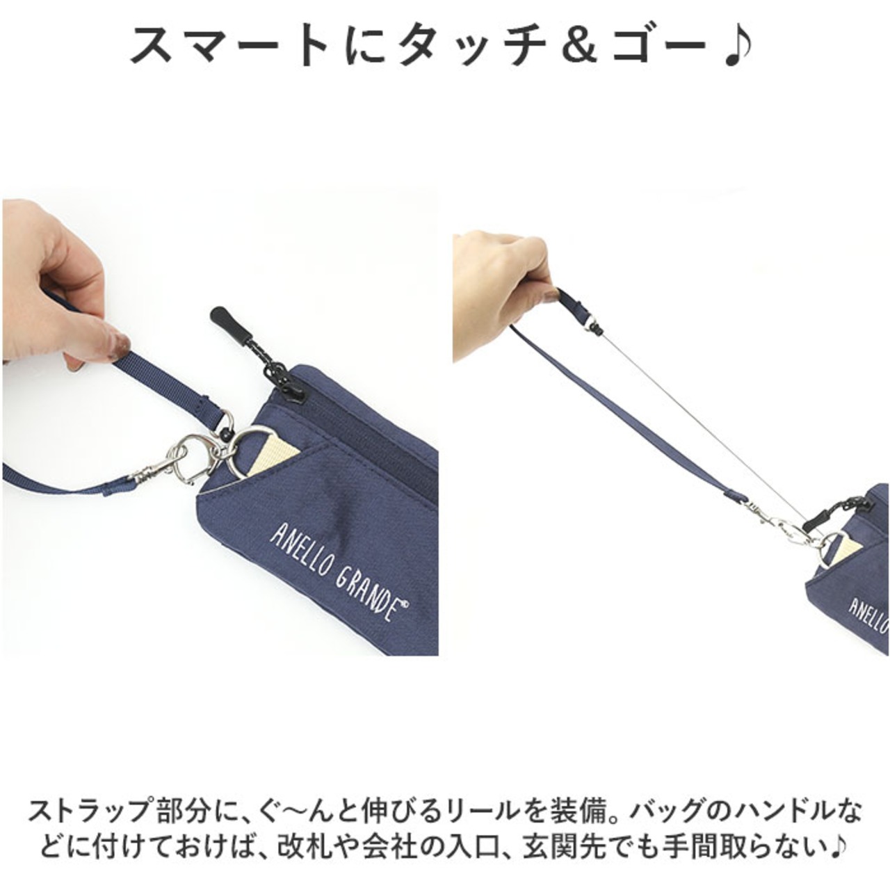 ・ストラップ部分に、ぐ~んと伸びるリールを装備。バッグのハンドルなどに付けておけば、改札や会社の入口、玄関先でも手間取らない♪