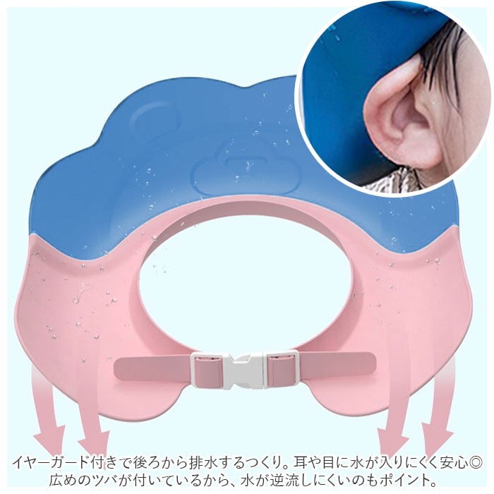 ・イヤーガード付きで後ろから排水するつくり。耳や目に水が入りにくく安心◎