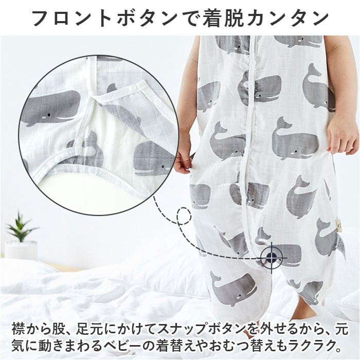 ・襟から股、足元にかけてスナップボタンを外せるから、元気に動きまわるベビーの着替えやおむつ替えもラクラク。