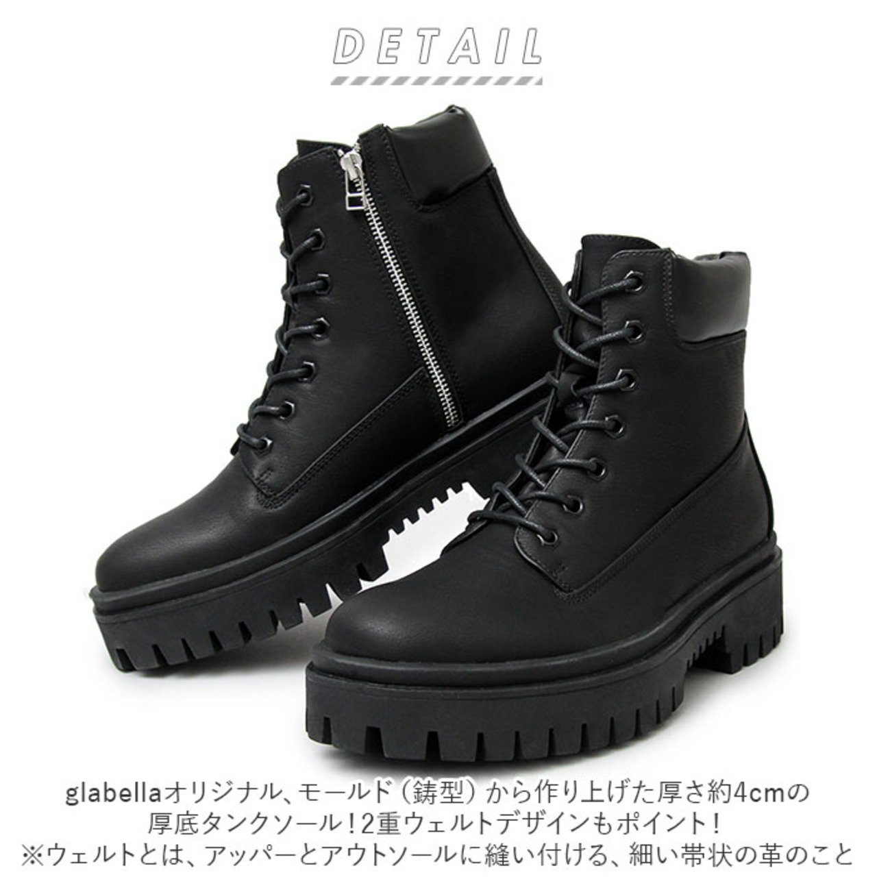 ・glabellaオリジナル、モールド(鋳型)から作り上げた厚さ約4cmの厚底タンクソール!2重ウェルトデザインもポイント!(※ウェルトとは、アッパーとアウトソールに縫い付ける、細い帯状の革のこと。)
