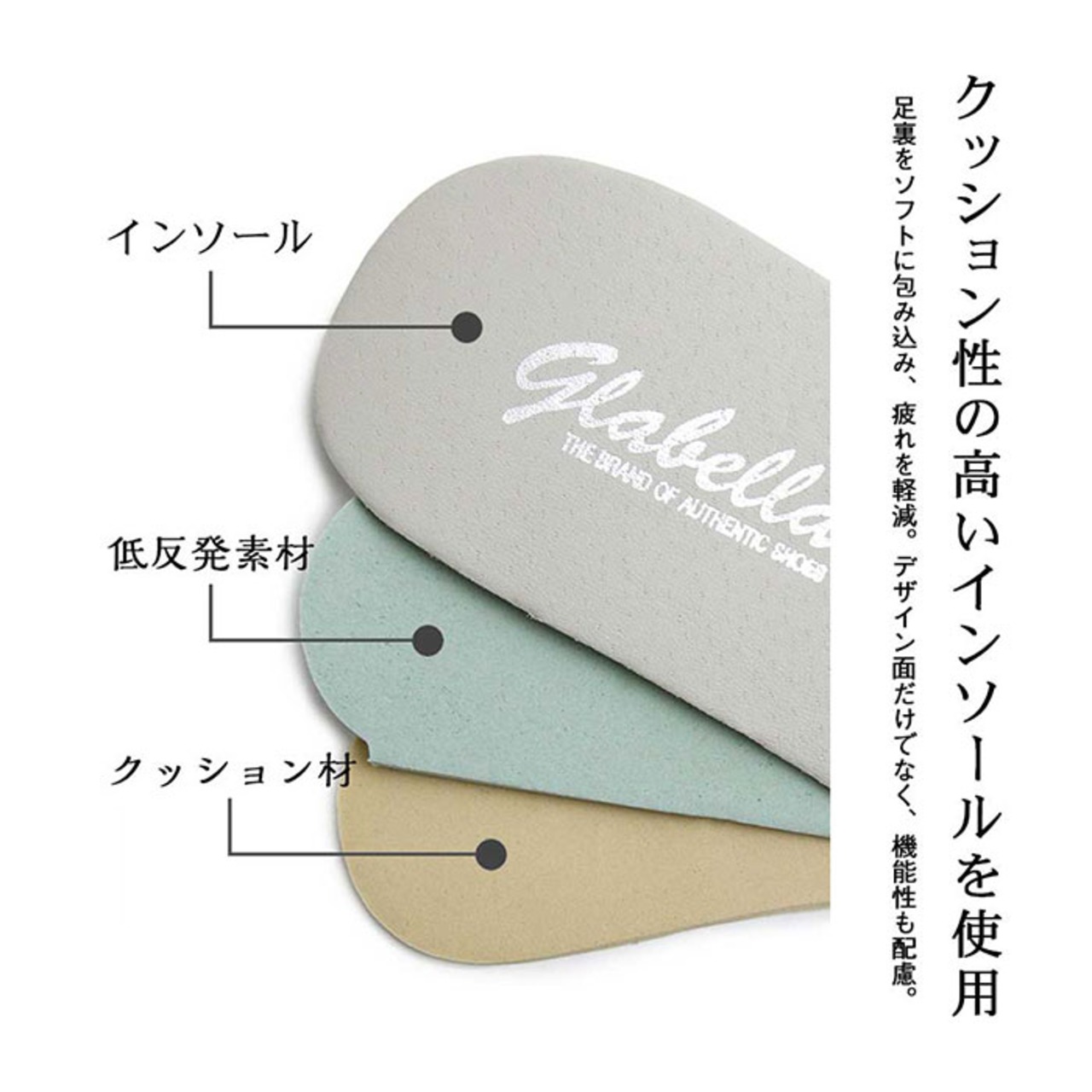 ・インソールには、かかと部分に程よくクッション性のある素材を使用。足裏をソフトに包み込んでくれて、足の疲れを軽減!