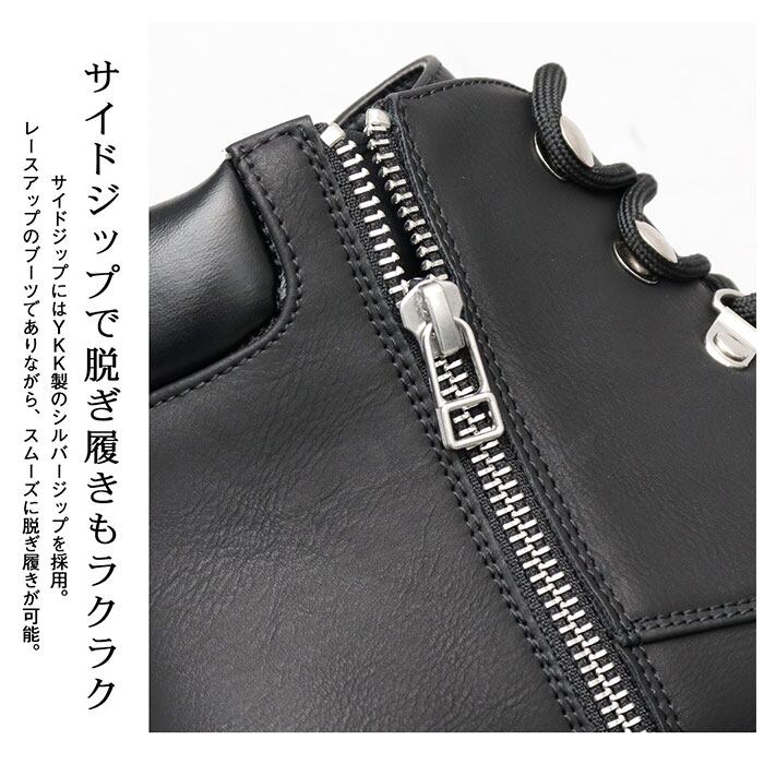 ・ブーツの脱ぎ履きの煩わしさを軽減してくれる、片サイドジップ仕様。レースアップシューズながら、脱ぎ履きがスムーズ!ジップはYKK製。
