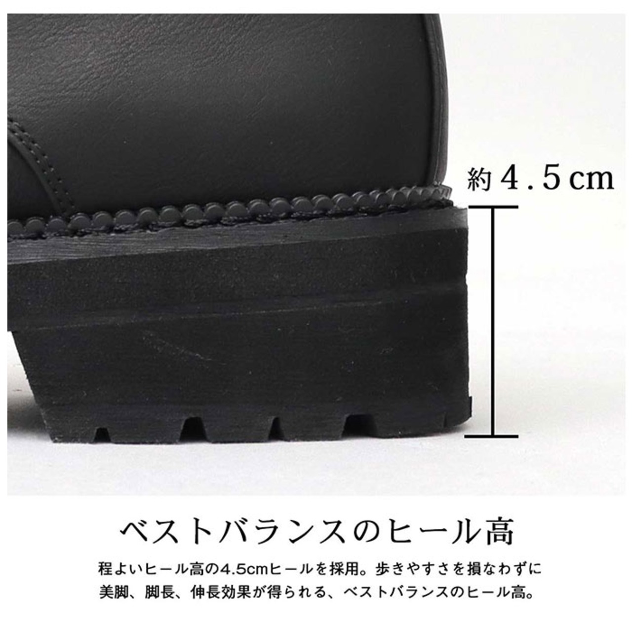 ・軽量素材を採用した厚底タンクソールは、安定感がありバランスの良い4.5cmのヒール設計。前側にも厚みを持たせることでヒールが目立ちすぎず、軽い履き心地で自然にスタイルアップも叶う!