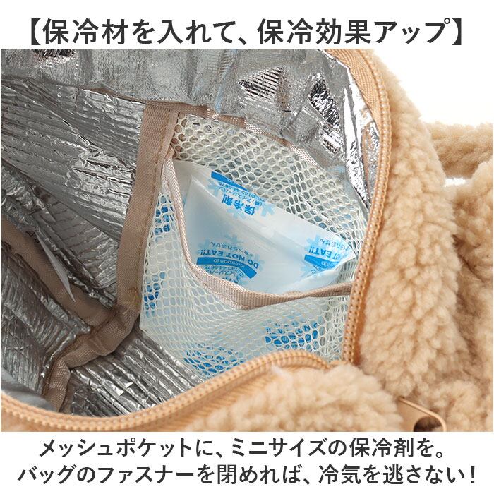 ・メッシュポケットに、ミニサイズの保冷剤を。バッグのファスナーを閉めれば、冷気を逃さない!