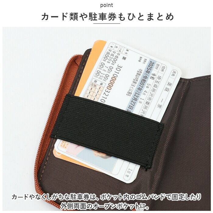 ・カードやなくしがちな駐車券は、ポケット内のゴムバンドで固定したり外側両面のオープンポケットに。