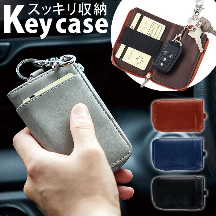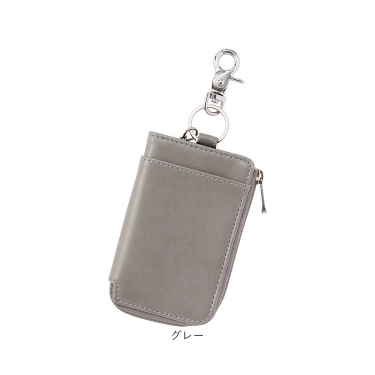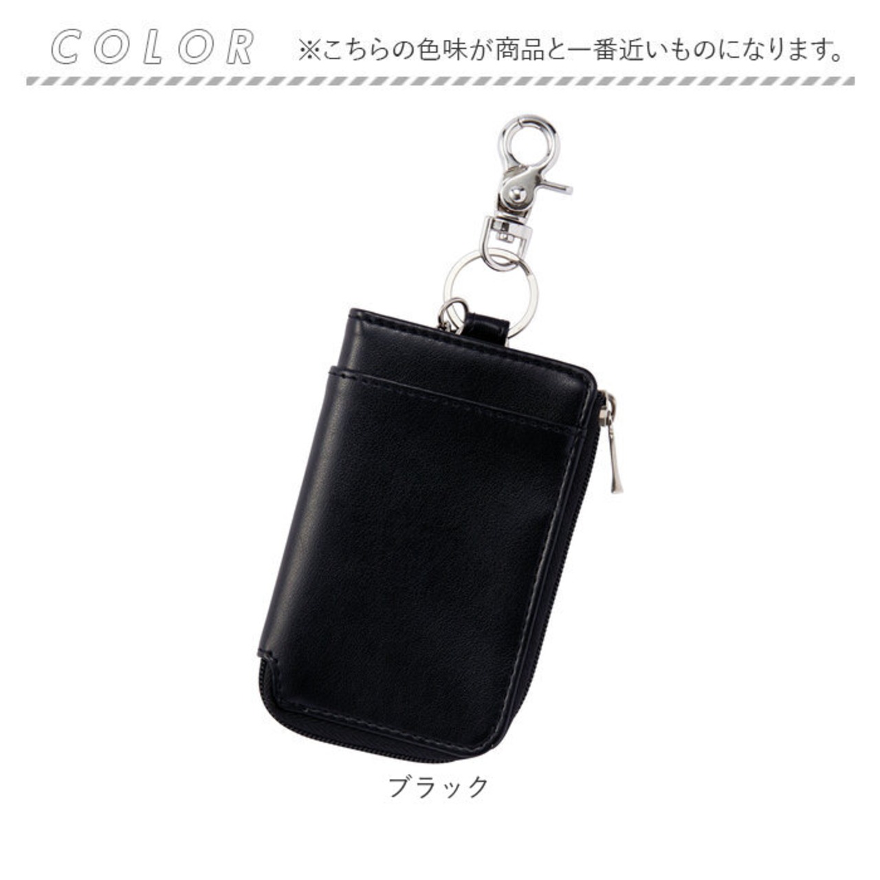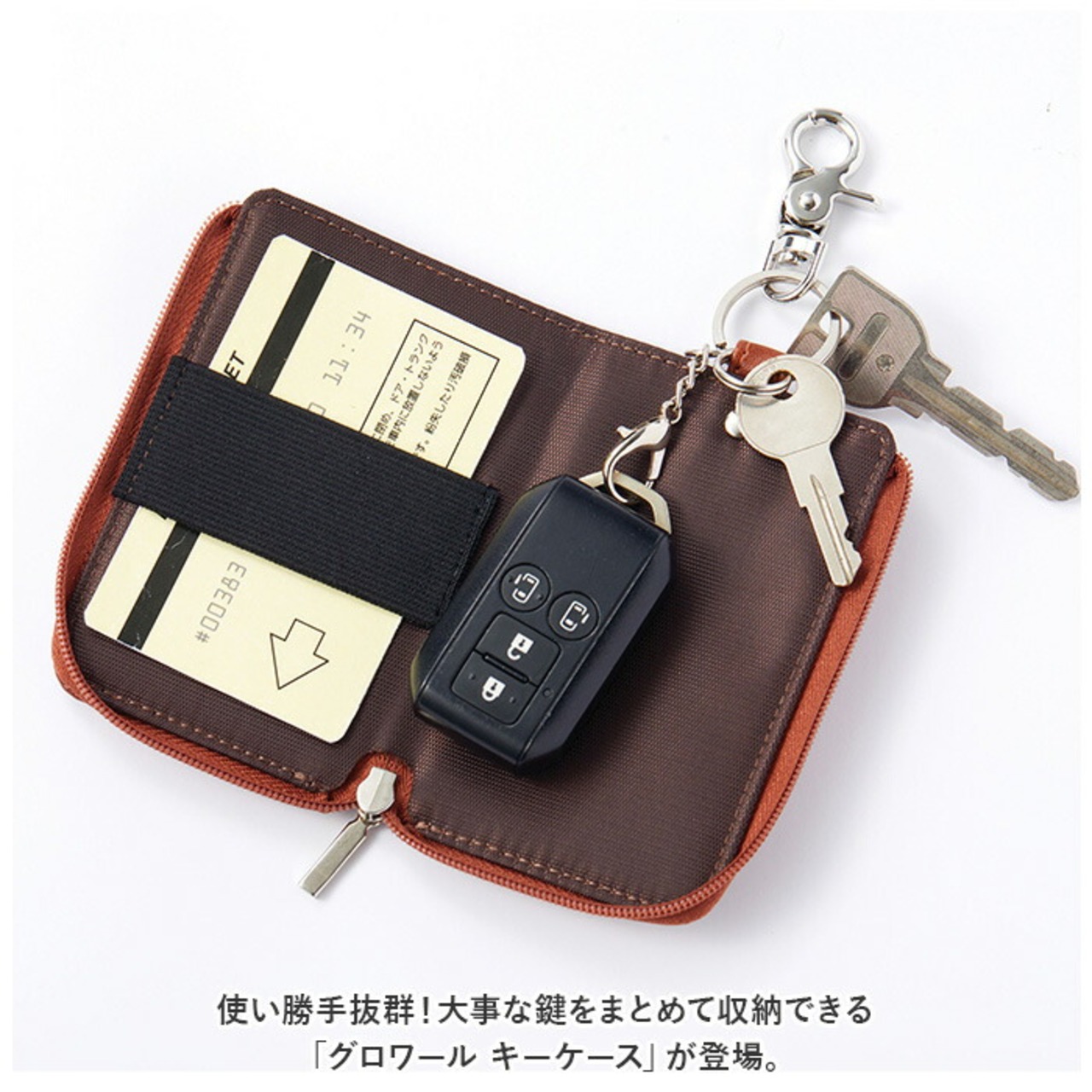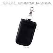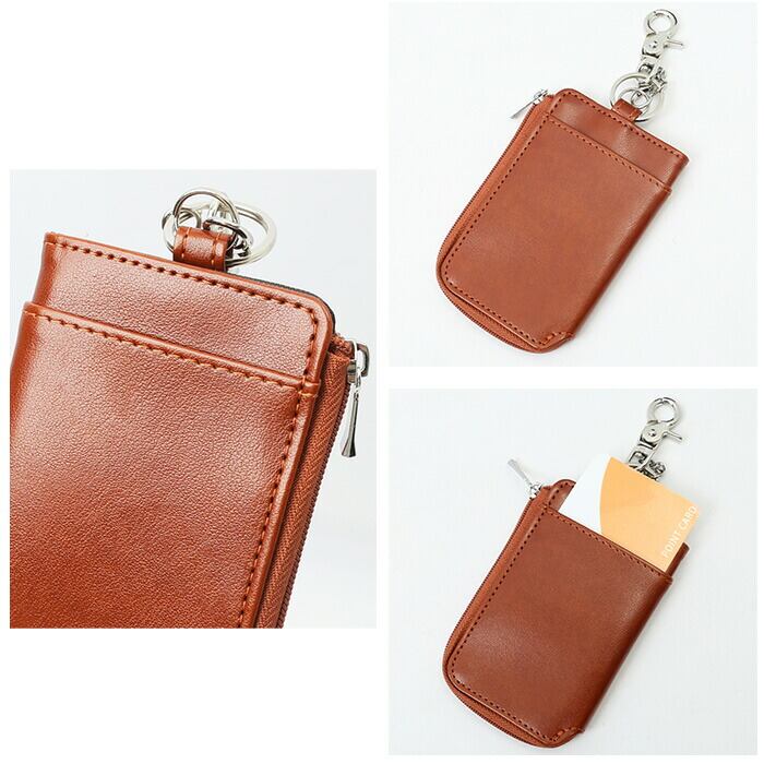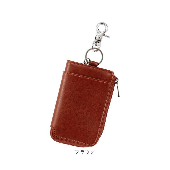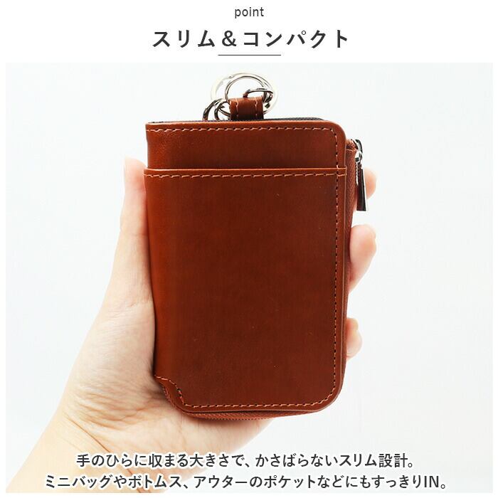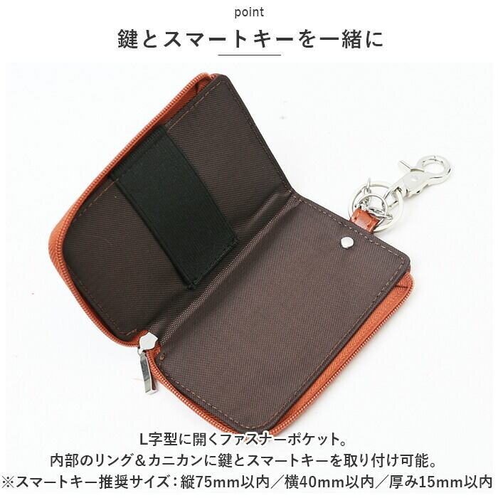・L字型に開くファスナーポケット。内部のリング&カニカンに鍵とスマートキーを取り付け可能。(※スマートキー推奨サイズ:縦75mm以内/横40mm以内/厚み15mm以内)