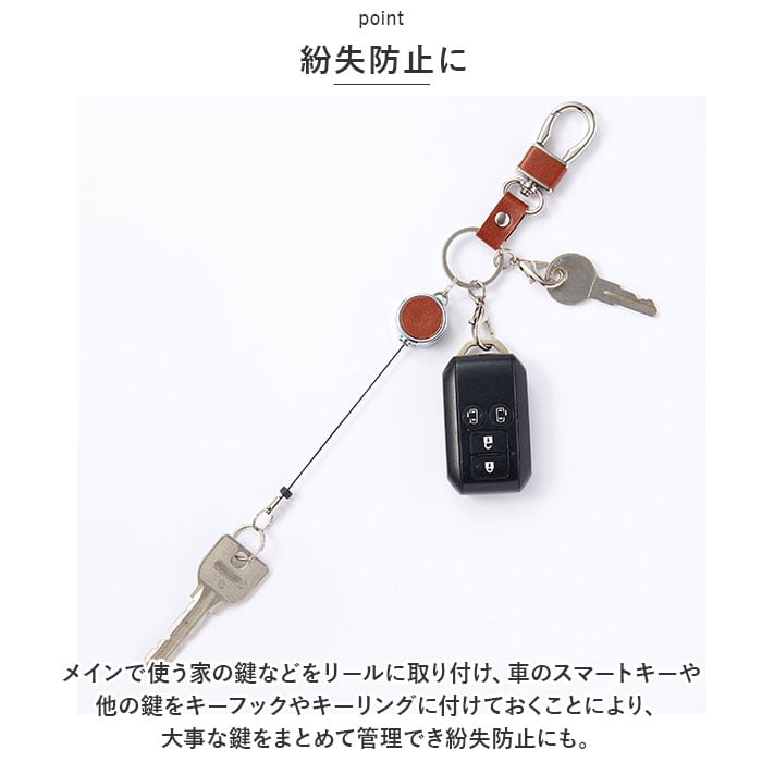 ・メインで使う家の鍵などをリールに取り付け、車のスマートキーや他の鍵をキーフックやキーリングに付けておくことにより、大事な鍵をまとめて管理でき紛失防止にも。