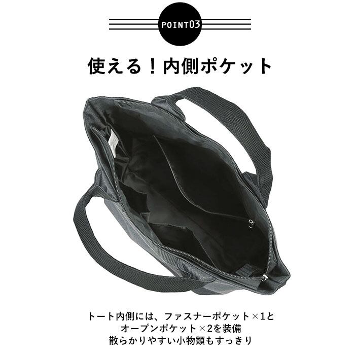 ・トート内側には、ファスナーポケット×1とオープンポケット×2を装備。散らかりやすい小物類もすっきり。