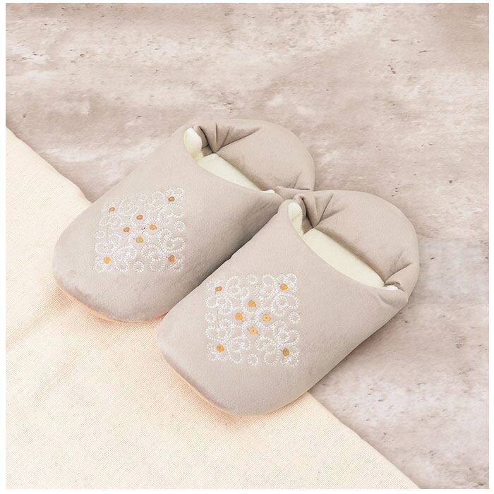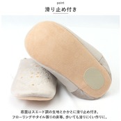 ・底面はスエード調の生地とかかとに滑り止め付き。フローリングやタイル張りの床等、歩いても滑りにくい作りに。
