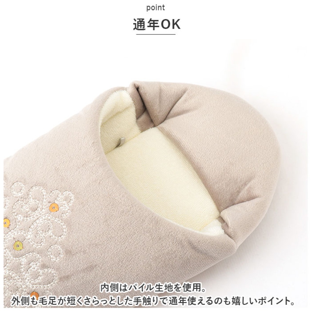 ・内側はパイル生地を使用。外側も毛足が短くさらっとした手触りで通年使えるのも嬉しいポイント。