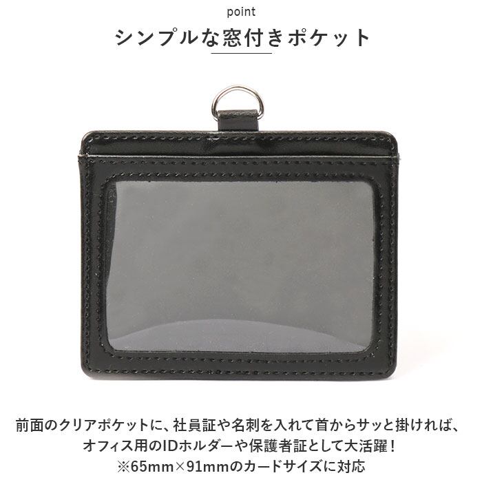 ・前面のクリアポケットに、社員証や名刺を入れて首からサッと掛ければ、オフィス用のIDホルダーや保護者証として大活躍!(※65mm×91mmのカードサイズに対応)