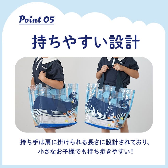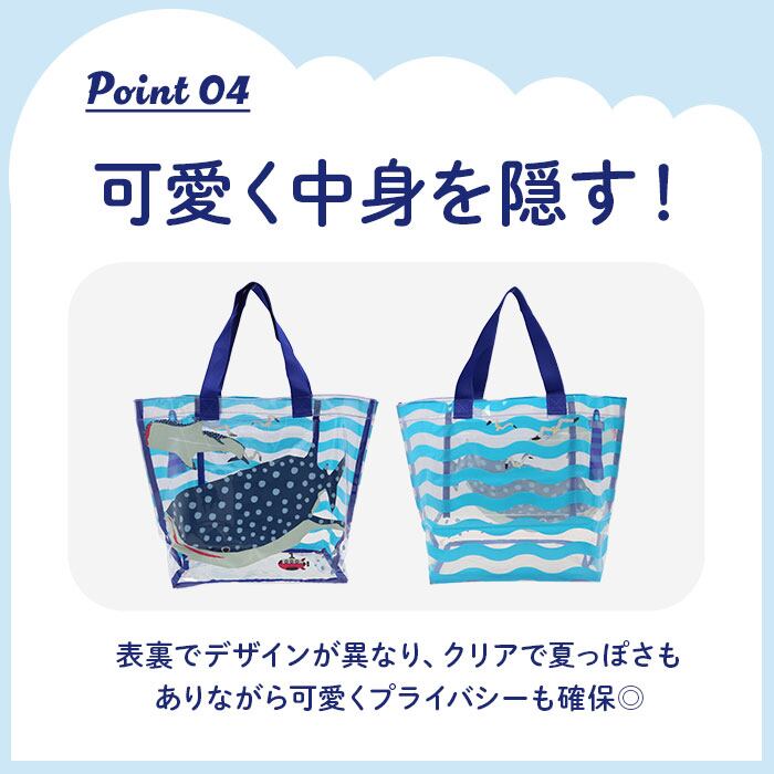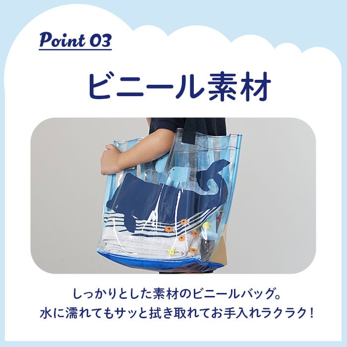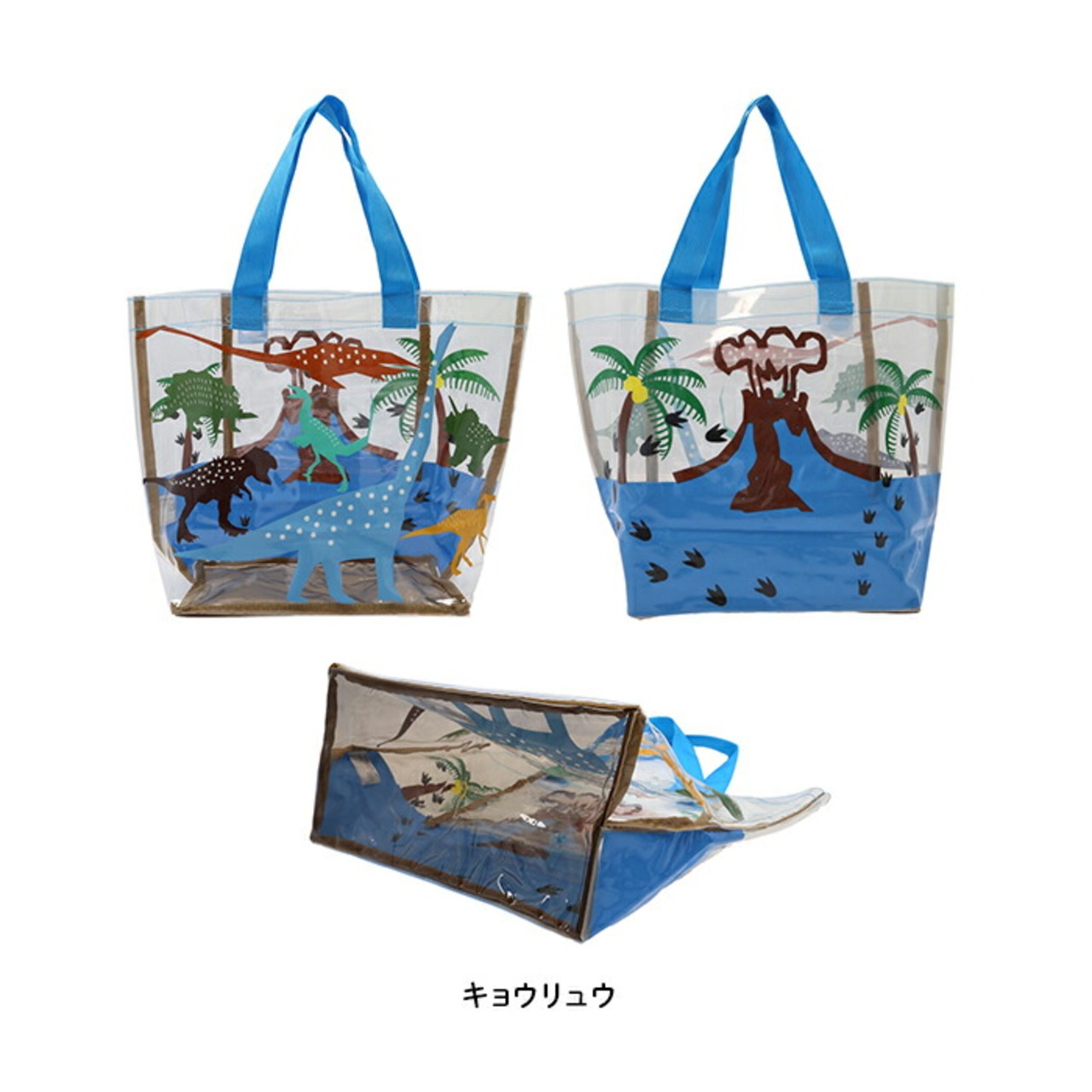 ・しっかりとした素材のビニールバッグ。水に濡れてもサッと拭き取れるので雨の日のお出かけバッグにしても◎