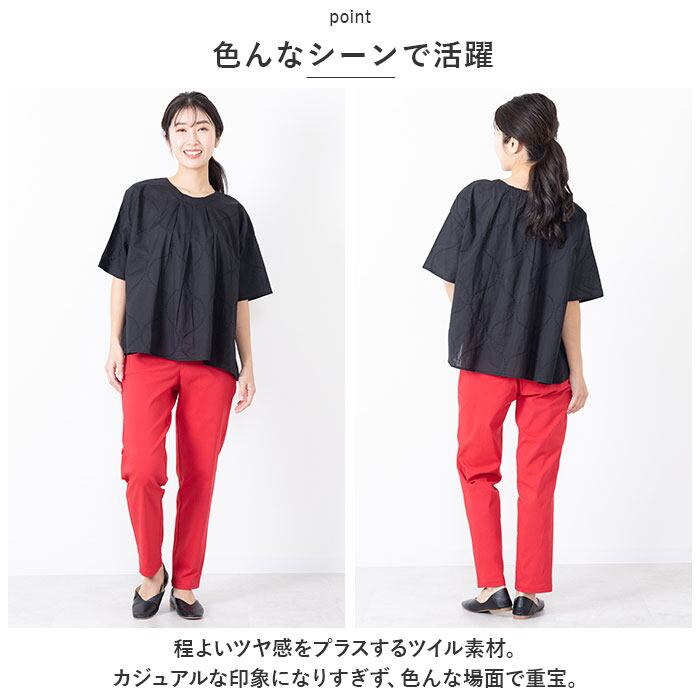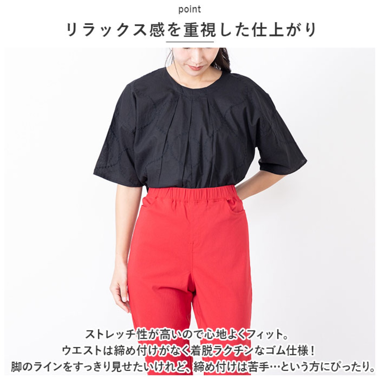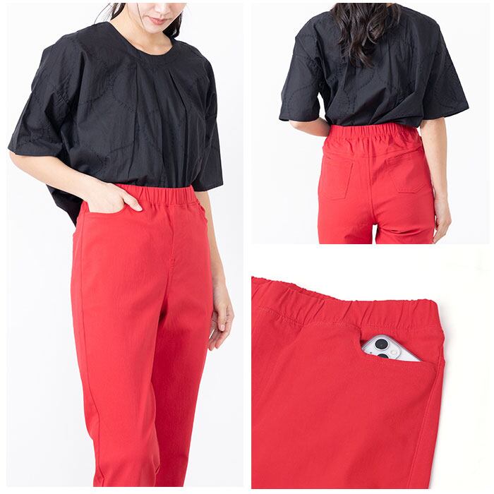 ・ストレッチ性が高いので心地よくフィット。ウエストは締め付けがなく着脱ラクチンなゴム仕様!脚のラインをすっきり見せたいけれど、締め付けは苦手…という方にぴったり。