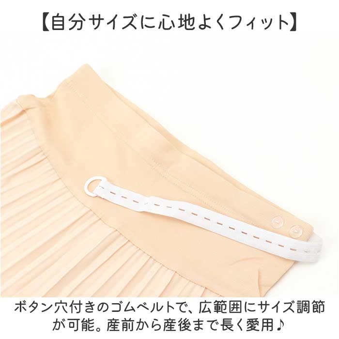 ・ボタン穴付きのゴムベルトで、広範囲にサイズ調節が可能。産前から産後まで長く愛用♪