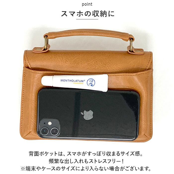 ・背面ポケットは、スマホがすっぽり収まるサイズ感。頻繁な出し入れもストレスフリー!(※端末やケースのサイズにより入らない場合がございます。)
