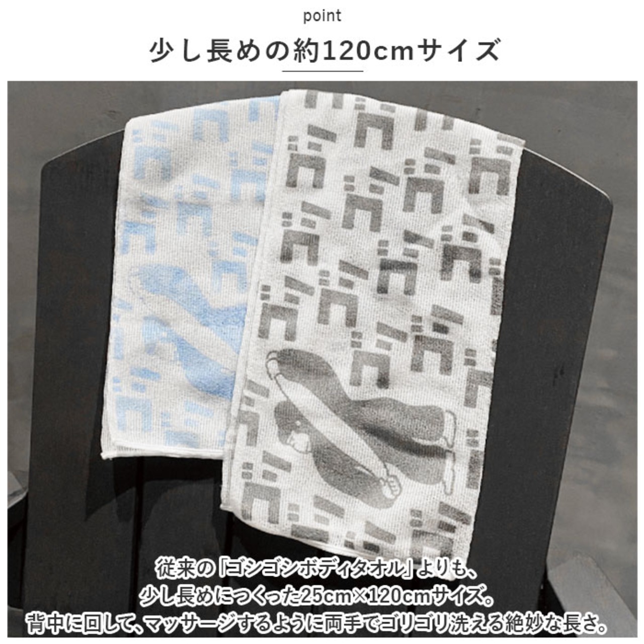 ・従来の「ゴシゴシボディタオル」よりも、少し長めにつくった25cm×120cmサイズ。背中に回して、マッサージするように両手でゴリゴリ洗える絶妙な長さ。