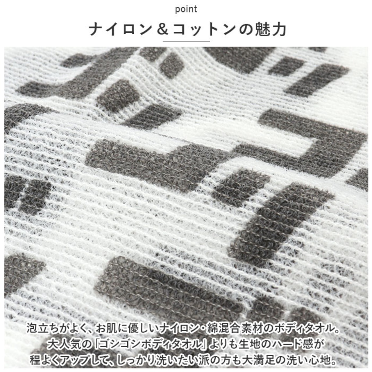 ・泡立ちがよく、お肌に優しいナイロン・綿混合素材のボディタオル。大人気の「ゴシゴシボディタオル」よりも生地のハード感が程よくアップして、しっかり洗いたい派の方も大満足の洗い心地。