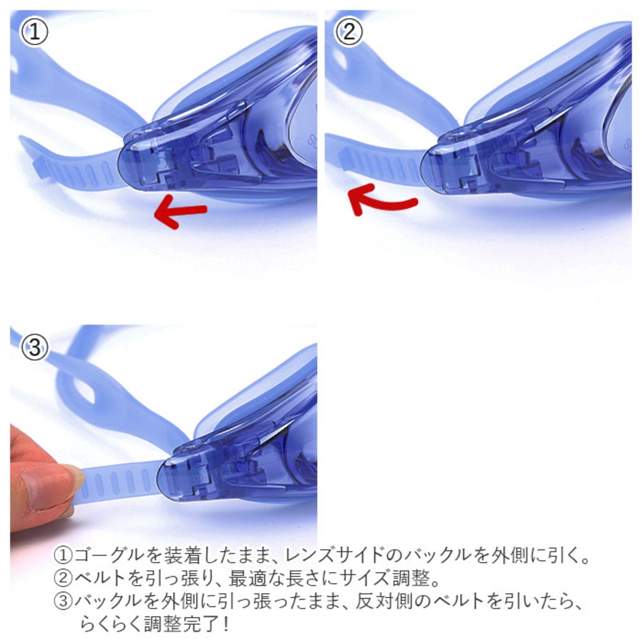 ・プールでの水泳運動のあとゴーグルをもう少しぴったりフィットさせたい・・・!そんな時はゴーグルを掛けたまま「ワン・ツー・スリー」で簡単ベルト調整!