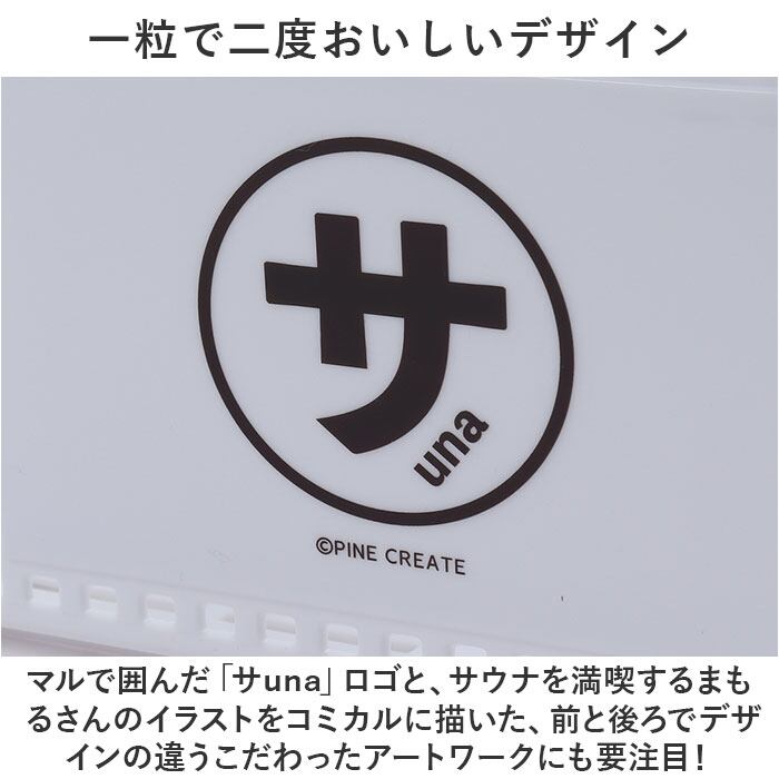 ・マルで囲んだ「サuna」ロゴと、サウナを満喫するまもるさんのイラストをコミカルに描いた、前と後ろでデザインの違うこだわったアートワークにも要注目!