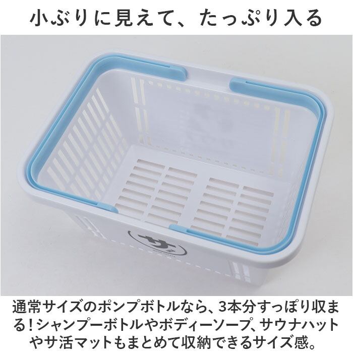 ・通常サイズのポンプボトルなら、3本分すっぽり収まる!シャンプーボトルやボディーソープ、サウナハットやサ活マットもまとめて収納できるサイズ感。