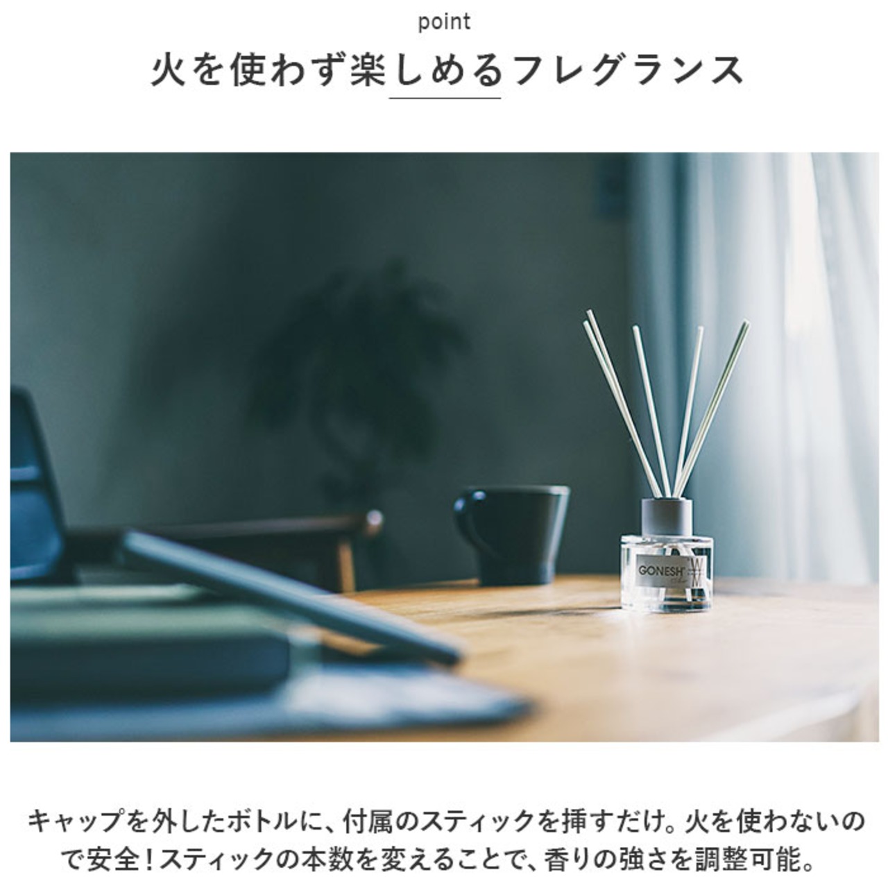 ・キャップを外したボトルに、付属のスティックを挿すだけ。火を使わないので安全!スティックの本数を変えることで、香りの強さを調整可能。