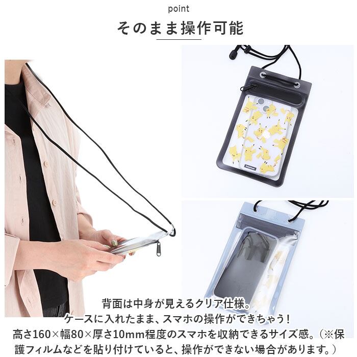 ・背面は中身が見えるクリア仕様。ケースに入れたまま、スマホの操作ができちゃう!高さ160×幅80×厚さ10mm程度のスマホを収納できるサイズ感。(※保護フィルムなどを貼り付けていると、操作ができない場合があります。)