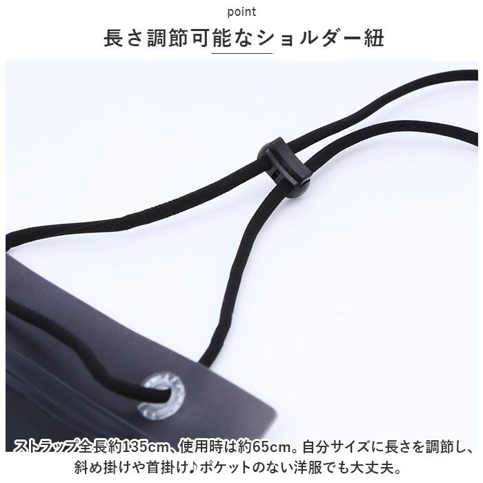 ・ストラップ全長約135cm、使用時は約65cm。自分サイズに長さを調節し、斜め掛けや首掛け♪ポケットのない洋服でも大丈夫。