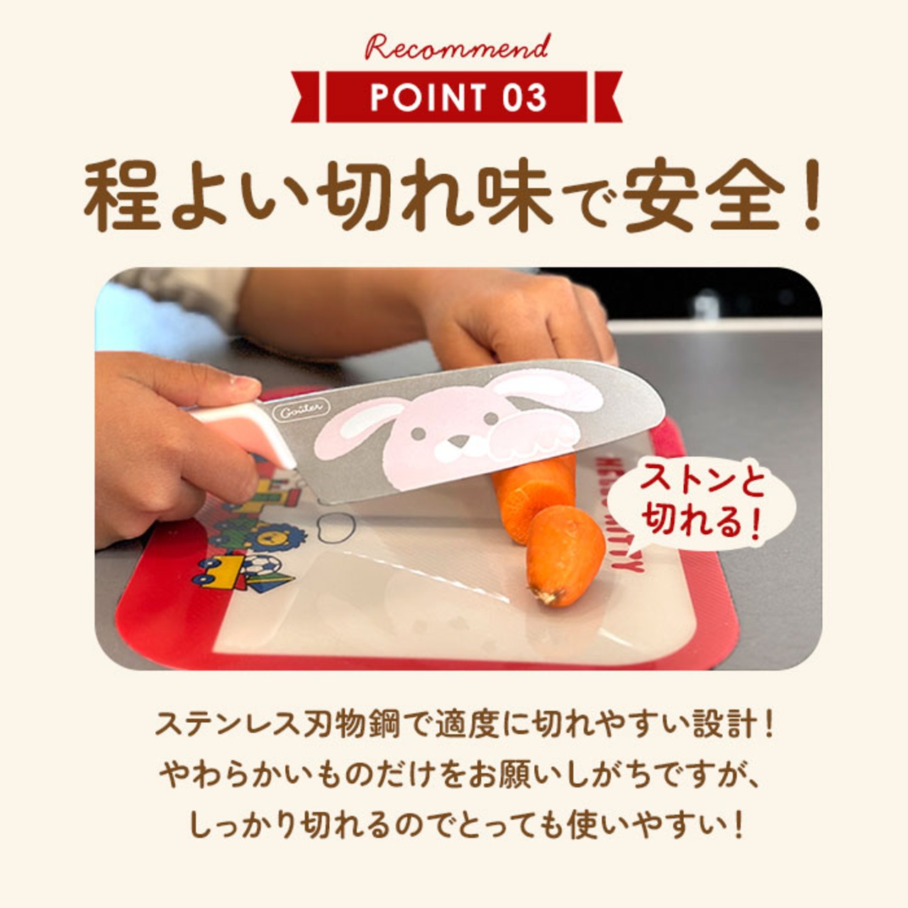・刃の部分にプリントされた動物のように、グーの手を真似っ子♪食材をおさえる時の安全な手の添え方を、自然にレクチャー!