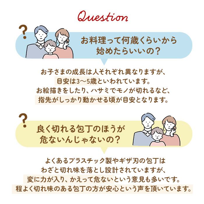 ・包丁の先と角を丁寧に丸めたフォルムで安心・安全◎小さな手でも握りやすい、丸みのあるグリップハンドルもポイント。
